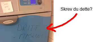 I serien «ting du tror du aldri vil oppleve» inngikk for vår del inntil i dag at en beboer velger å skrive «DRITTMASKIN» med sprittusj på en av vaskerimaskinene.