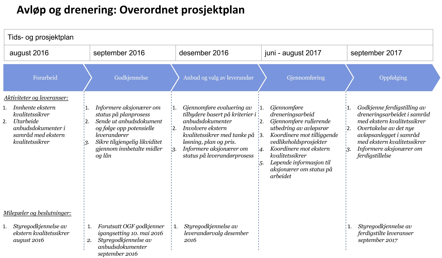Alle prosjektene gjennomgås i detalj, og hvert prosjekt utvikler et mandat og en tidsplan. Et eksempel på overordnet plan for prosjektet Avløp og drenering ser ut som følger: