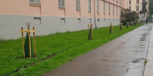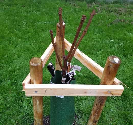 Trærne er oppstammet blå/ lilla syrin med sammenføyde staur og vanningspose på hvert tre og er plantet i kompostert jord.
