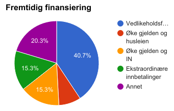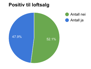 Vi mottok 48 besvarelser på undersøkelsen. Dersom vi tar utgangspunkt i at vi er 88 boenheter og at hver boenhet kun svarte én gang, gir dette en svarprosent på 55 %. 48 % sier ja til å selge loftet, 52 % sier nei. Samtidig mener de fleste at vi bør lage et vedlikeholdsfond med midler fra loftsalget.