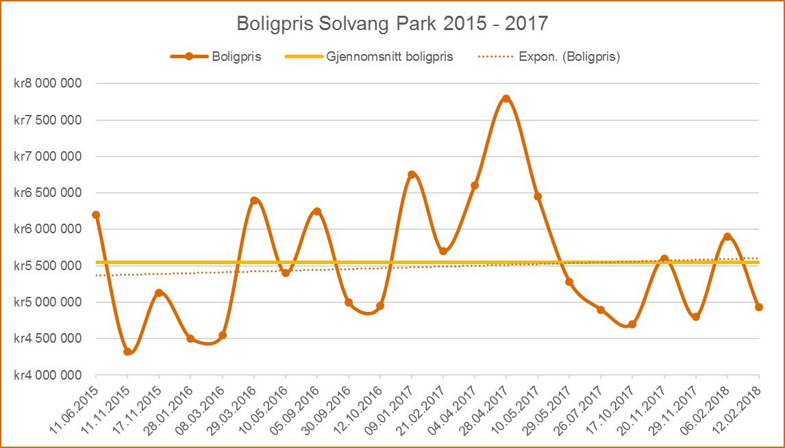 Gjennomsnittsprisen for boligene i Solvang Park har det siste året (2017 og hittil i 2018) ligget på 5.8 millioner kroner. Dette er noe høyere enn gjennomsnittsprisen for nabolaget, som det siste året har vært 5.4 millioner kroner (kilde: Eiendomsverdi AS).