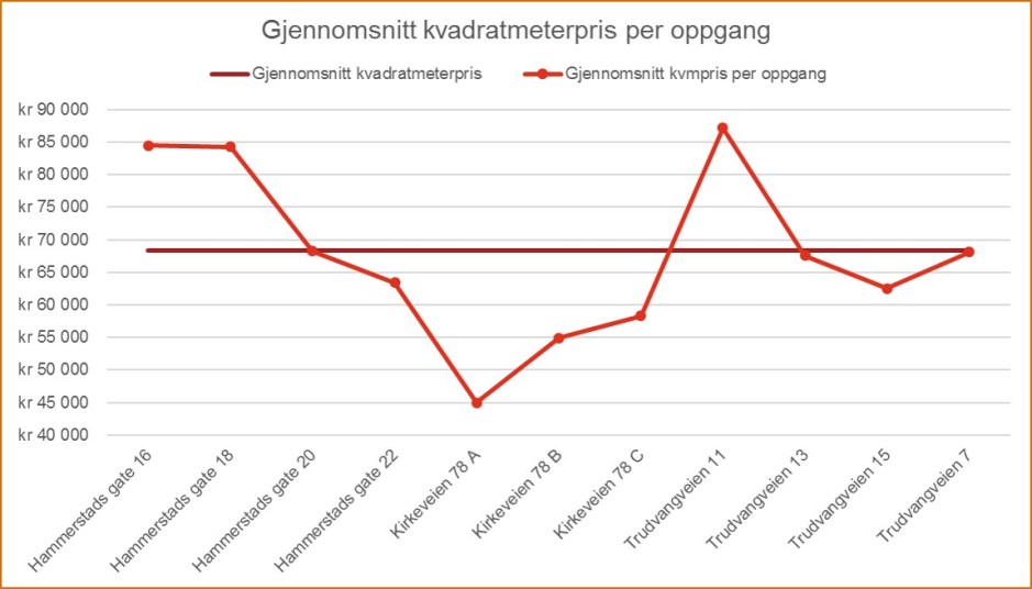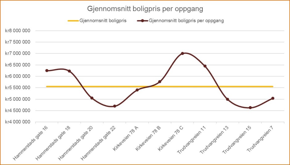 Dersom vi fokuserer inn på pris per oppgang troner Kirkeveien 78 C som den dyreste adressen.