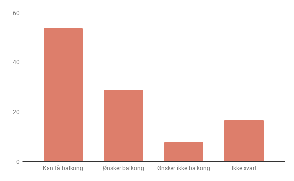 Av 54 enheter som har brannbalkong, har 37 svart på undersøkelsen. 29 ønsker balkong, kun 8 stykker ønsker ikke balkong og de resterende 17 har ikke svart. Vi kan derfor regne med at andelen som vil delta på utbedringen vil øke.