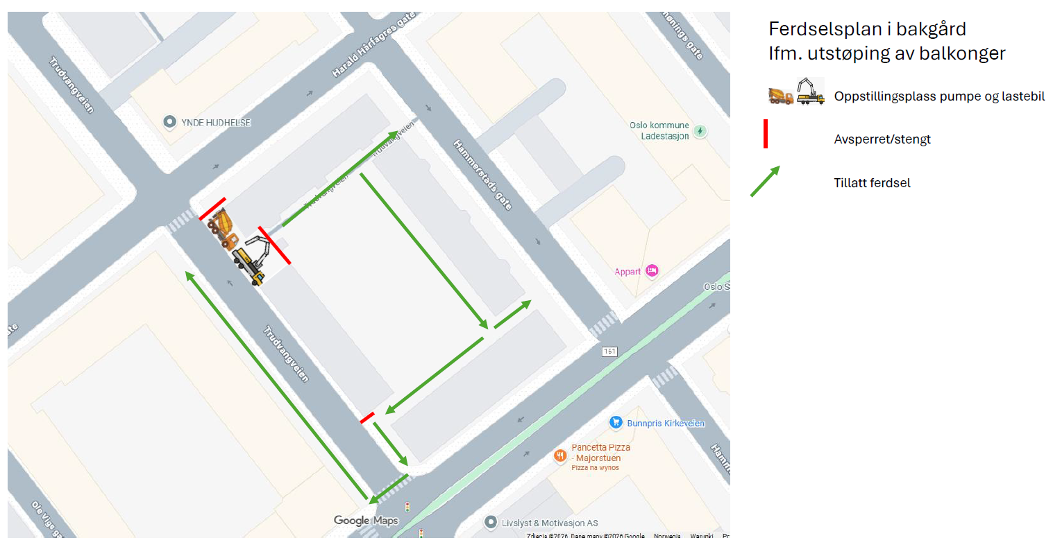 Balkonger i 2. etasje i Trudvangveien 7-11 og 13-22 vil mest sannsynlig støpes 29. – 30. januar. I denne perioden vil porten ut mot Trudvangveien 13 være stengt og alle må benytte portene som vist i kartet under. Tillatt ferdsel er markert med grønne piler.