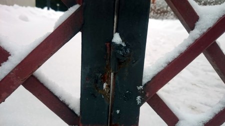 Porten i TV7 er delvis ødelagt etter det som tilsynelatende er vel hardhendt bruk.