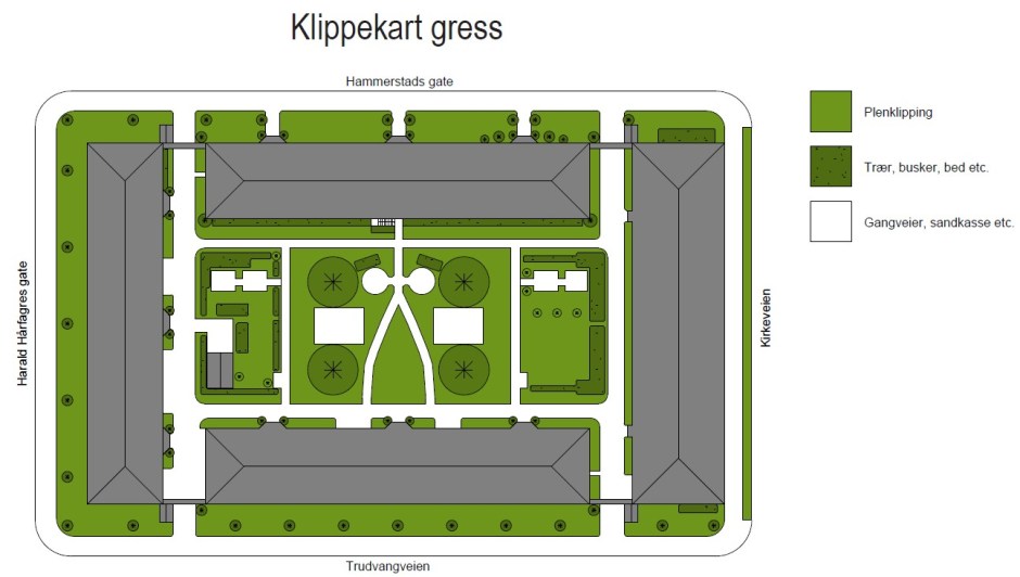 Vaktmester klipper gress og kanter 1 gang per uke i vekstsesongen fra og med april til og med september. Gress fjernes ved behov.