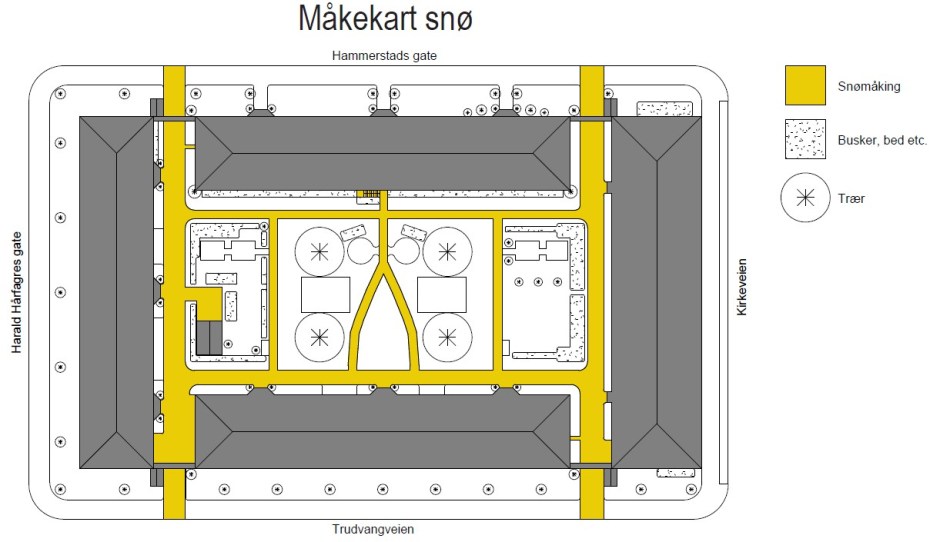 Vaktmester måker fritt for snø ved behov i vintersesongen fra og med november til og med mars, følgende områder, uoppfordret av oppdragsgiver: